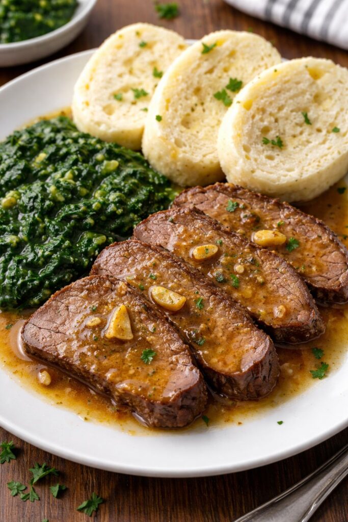 1. Maso osolte, opepřete a potřete prolisovaným česnekem (část česneku si nechte do výpeku).